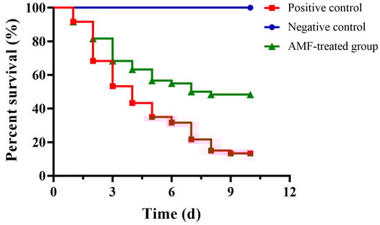 The above results demonstrated that AMF could reduce the virulence of A. hydrophila in vitro. As shown in Figure 5, deaths were observed 24 h post-infection in positive control and AMF-treated groups; the mortality of the positive control group was 86.67% at the end of the experiment, while the mortality of fish in the AMF-treated group was 51.67%. All fish in the negative control group were alive during the experimental period (Figure 5). The data were processed by Kaplan–Meier analysis and log-rank test; we found that fish administered 20 mg/kg AMF could significantly reduce the mortality caused by A. hydrophila infection compared with the positive control group.
