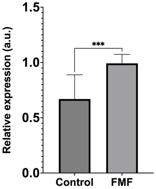 Comparison of relative ENHO expression levels between healthy controls and FMF patients. ENHO expression levels were significantly higher in the FMF patient group compared to the control group (Mann–Whitney U test, *** p = 0.0007). Data are calculated as 2−ΔCt and represented in arbitrary units (a.u.). Error bars indicate standard error of the mean.