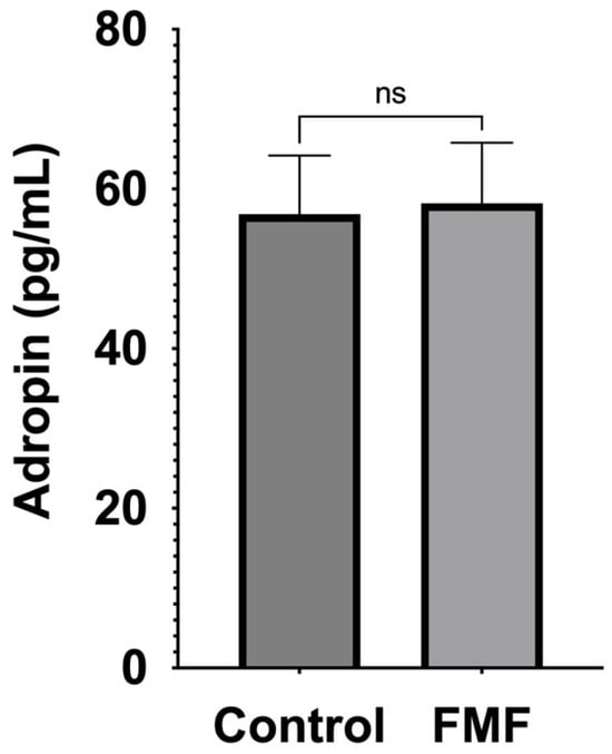 Adropin is a secretory molecule encoded by the Energy Homeostasis-Associated Gene (ENHO) that plays an active role in energy homeostasis. The ENHO is expressed in various organs and tissues, including endothelial cells, as well as the liver, brain, pancreas, heart, muscles, umbilical vein, and kidneys. Adropin is involved in the regulation of energy balance, insulin sensitivity, and the metabolism of glucose and lipids. In addition to its metabolic functions, Adropin also mediates non-metabolic processes, including angiogenesis, apoptosis, and inflammation []. The association of Adropin with inflammation and vasculopathy suggests its potential involvement in inflammatory diseases. Previous studies have investigated serum Adropin levels and ENHO expression in patients with systemic sclerosis, Behçet’s disease, rheumatoid arthritis (RA), and systemic lupus erythematosus [,]. FMF is a condition with an incompletely understood pathogenesis, which poses challenges for both its accurate diagnosis and effective treatment []. Although colchicine is the standard therapy for FMF, around one-third of patients achieve only partial remission, while approximately 5–10% do not respond to treatment []. Aside from an MEFV analysis, there are no specific laboratory tests available to substantiate the diagnosis of FMF. No genetic mutations can be detected in approximately 30–40% of patients with FMF [].