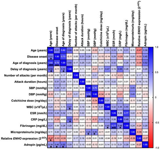 Correlation analysis between the clinical variables and Adropin levels, and ENHO expression levels in the FMF patient group. The results are displayed in a correlation matrix. A Spearman’s correlation analysis is applied to assess the relationships between the variables, except for Fibrinogen, relative ENHO expression, and age of diagnosis, which follow a Gaussian distribution. A Pearson’s correlation analysis is applied to these variables. Each number within the boxes corresponds to the correlation coefficient between two variables. The cells are color-coded based on the strength and direction of the correlations: shades of blue indicate positive correlations, while shades of red represent negative correlations. Cells marked with an asterisk (*) indicate statistical significance at the level p < 0.05; cells with (**) indicate statistical significance at the level p < 0.001. SBP: systolic blood pressure; DBP: diastolic blood pressure; WBC: white blood cell; ESR: erythrocyte sedimentation rate; CRP: C-reactive protein.