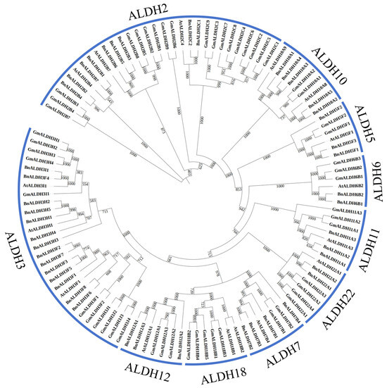 2.2. Distribution and Phylogenetic Analysis of the ALDH Superfamily in Brassica napus L., Arabidopsis, and Soybean