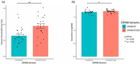 Bar plots of IonOptix analysis of isolated cardiomyocytes from our wild-type CRYAB (blue) and CRYABR123W (red) mouse models. (a) IonOptix Sin Exp Tau, a measure of calcium reuptake, for wild-type CRYAB and CRYABR123W is shown, with a significantly increased value in CRYABR123W, which suggests impaired calcium reuptake and myocyte relaxation. (b) IonOptix baseline sarcomere length, demonstrating that CRYABR123W myocytes have significantly increased baseline sarcomere length compared to the wild type. * p < 0.05, ** p < 0.01.