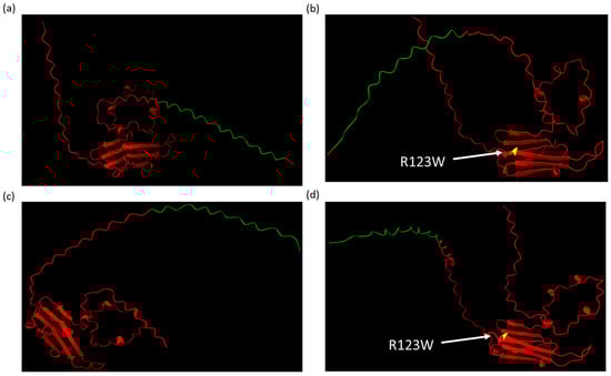 AlphaFold structures visualized in ChimeraX of CRYAB proteins (red) tagged with a triple FLAG tag (green) and mutated residues (yellow with white label): (a) wild-type CRYAB with N-terminal FLAG tag; (b) CRYABR123W with N-terminal FLAG tag; (c) wild-type CRYAB with C-terminal FLAG tag; and (d) CRYABR123W with C-terminal FLAG tag.