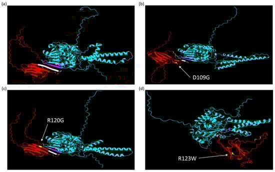 AlphaFold structures visualized in ChimeraX of CRYAB proteins (red) interacting with calcineurin (blue), with labeling of the predicted interacting amino acids of CRYAB (white) and calcineurin (pink) and the mutated CRYAB residue (yellow with white label): (a) wild-type CRYAB binding well at the NFAT binding site of calcineurin; (b) CRYABD109G binding poorly at the NFAT binding site of calcineurin; (c) CRYABR120G binding poorly at the NFAT binding site of calcineurin; and (d) CRYABR123W binding well at the autoinhibitory domain of calcineurin.