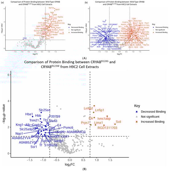 (A) Volcano plots depicting mass spectrometry data from co-immunoprecipitation of lysate from H9C2 cells expressing FLAG-tagged wild-type CRYAB, CRYABR120G, and CRYABR123W. Data are labeled with the corresponding protein and as having decreased binding (blue), no significant change (grey), or increased binding (red). (a) Volcano plot comparing wild-type CRYAB to CRYABR120G, showing significant increase in binding with minimal decrease. (b) Volcano plot comparing wild-type CRYAB to CRYABR123W, showing significant decreases and increases in protein binding, comparatively. (B) Volcano plot depicting mass spectrometry data from co-immunoprecipitation of lysate from H9C2 cells expressing FLAG-tagged CRYABR120G and CRYABR123W. Data are labeled with the corresponding protein and as having decreased binding (blue), no significant change (grey), or increased binding (red). The comparison between CRYABR120G and CRYABR123W shows that CRYABR123W has distinct changes in protein–protein interactions. For all analyses, significance was based on a protein having both a p-value less than 0.05 and fold change greater than 2 graphed as horizontal −log10(p-value) and vertical log2(FC) dotted lines respectively.