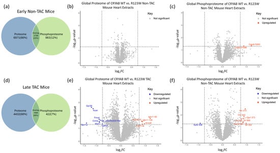 To investigate the changes in cellular protein composition and pathways, we compared wild-type CRYAB and CRYABR123W global mouse heart extracts with and without pressure overload in the form of TAC. For the mice without TAC, we found 6971 unique proteins, 983 unique phosphorylated proteins, and 1726 proteins common to both (Figure 6a). For mice with TAC, we found 4432 unique proteins, 422 unique phosphorylated proteins, and 1620 proteins common to both (Figure 6d). Without additional pressure overload, the CRYABR123W mutation does not induce an HCM phenotype in our mouse model [], a common condition of HCM mouse models [] as few develop spontaneous HCM [,,,]. Unsurprisingly, without TAC, we observed few significant changes in protein expression or phosphorylation (Figure 6b,c). However, following TAC and the emergence of a pathological hypertrophic phenotype, we observed a significant change in expression of proteins and phosphorylated proteins (Figure 6e,f), notably a downregulation of Grp39, Lgals3, and Sytl3(P), while Anax6, Ppp1r1b, Slc25a15, Hrc(P), and Atxn2l(P) were upregulated (Figure 6e,f). Given that the HCM phenotype does not develop unless there is additional stress on the heart, we designated the pathology of mouse hearts that have not undergone TAC as models of early-stage disease (Figure 6a–c) and those with TAC as models of late-stage disease (Figure 6d–f). As previously described by our lab group, the CRYABR123W mouse model developed systolic dysfunction following TAC [], a poor prognostic factor of patients with HCM [,], illustrating how our mouse model mimics late and severe stages of HCM pathology.