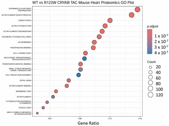 GO term analysis comparing mass spectrometry data from wild-type CRYAB and CRYABR123W mouse heart extracts following transverse aortic constriction. GO term analysis showed significant association with cytoskeletal pathways.