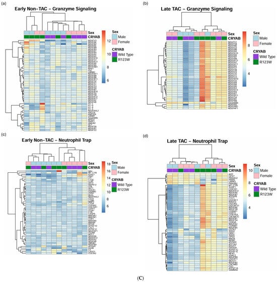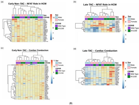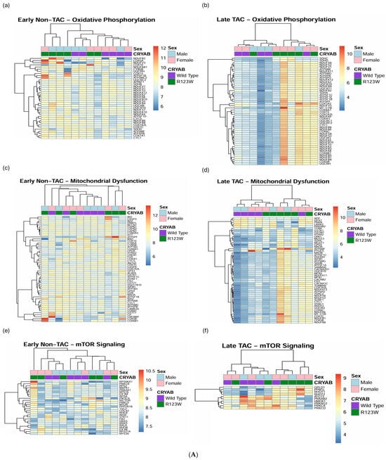 (A) Heatmaps based on genes from oxidative phosphorylation (a,b), mitochondrial dysfunction (c,d), and mTOR signaling (e,f) pathways identified by IPA using mass spectrometry data from wild-type CRYAB (purple) and CRYABR123W (green) mouse heart extracts with or without transverse aortic constriction. (a,c,e) Heatmaps showing results from early-stage disease in mice without transverse aortic constriction with poor clustering and gene expression differentiation. (b,d,f) Heatmaps showing results from late-stage disease in mice with transverse aortic constriction with improved clustering and gene expression differentiation. (B) Heatmaps based on genes from the role of NFAT in hypertrophic cardiomyopathy (a,b) and cardiac conduction (c,d) pathways identified by IPA using mass spectrometry data from wild-type CRYAB (purple) and CRYABR123W (green) mouse heart extracts with or without transverse aortic constriction. (a,c) Heatmaps showing results from early-stage disease in mice without transverse aortic constriction with poor clustering and gene expression differentiation. (b,d) Heatmaps showing results from late-stage disease in mice with transverse aortic constriction with improved clustering and gene expression differentiation. (C) Heatmaps based on genes from granzyme signaling (a,b) and neutrophil trap (c,d) pathways identified by IPA using mass spectrometry data from wild-type CRYAB (purple) and CRYABR123W (green) mouse heart extracts with or without transaortic constriction. (a,c) Heatmaps showing results from early-stage disease in mice without transverse aortic constriction with poor clustering and gene expression differentiation. (b,d) Heatmaps showing results from late-stage disease in mice with transverse aortic constriction with improved clustering and gene expression differentiation.