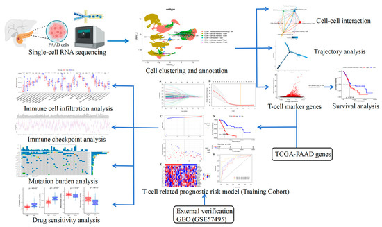 Considering the pivotal role of T-cells in tumor immunotherapy, comprehensively evaluating the molecular features and conditions of T-cells in individuals with PAAD could provide valuable information in forecasting the outcomes of immunotherapy [9]. In this study, the information from the PAAD dataset within the TCGA and GEO repositories was employed to establish and confirm a predictive model for PAAD patients at a cellular level. Through the amalgamation and examination of an extensive array of data from both scRNA-seq and bulk RNA sequencing (bulk RNA-seq), this study performed analysis for survival, the immune microenvironment, prognostication of response to immunotherapy, and drug susceptibility. The workflow of the whole study is shown in Figure 1. These endeavors are directed towards providing innovative perspectives within the field of immunotherapy for PAAD.