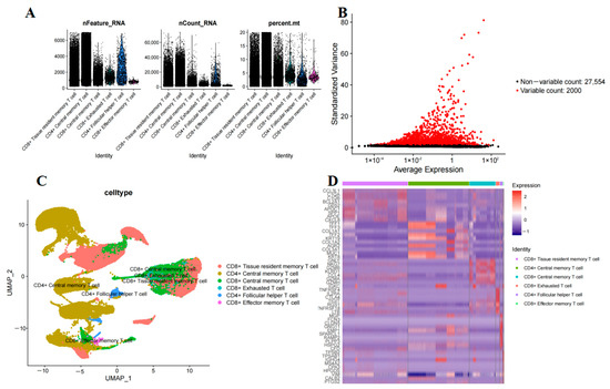 Cellular quality control and cluster analysis of scRNA-seq data were conducted utilizing the R package Seurat [49] (https://github.com/satijalab/seurat, accessed on 17 May 2024). Cells that had fewer than 200 genes, more than 7000 genes in total, and over 20% mitochondrial genes were excluded. The top 2000 hypervariable-expressing genes were identified using the FindVariableFeatures function. The R package harmony was employed for sample integration to mitigate batch effects. Subsequently, cell clusters were manually annotated based on established T-cell subtype marker genes [10,11], and differentially expressed genes (DEGs) within their subpopulations were identified.