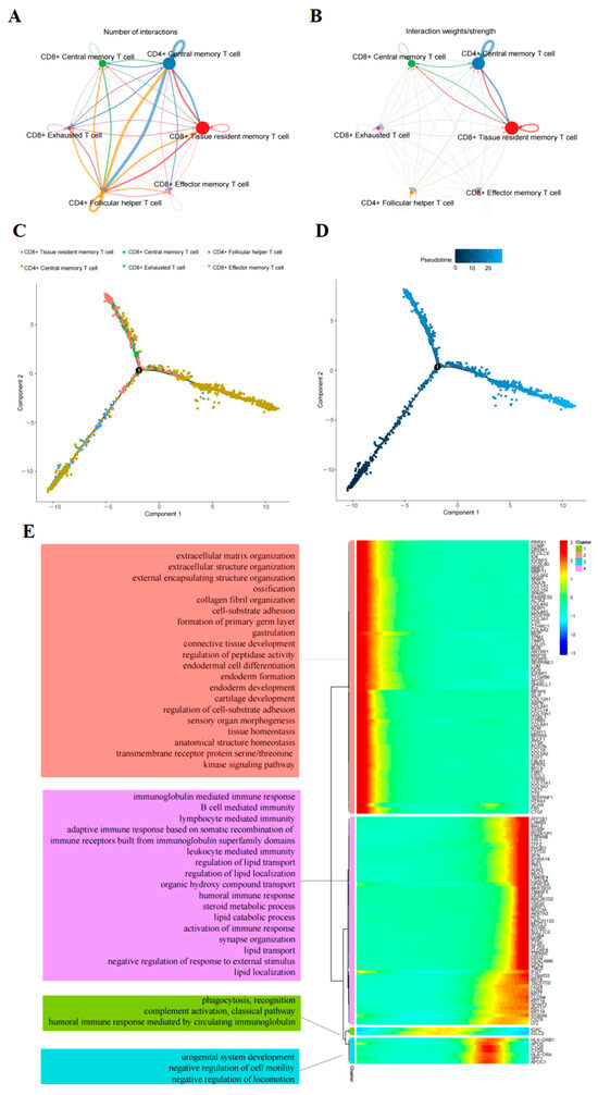 Analysis of T-cell trajectory and intercellular communication in pancreatic ductal adenocarcinoma (PAAD). (A,B) Quantification of interactions and strengths in communication networks between cells. (C,D) Diagram illustrating distinct T-cell clusters present in PAAD. (E) Heatmap displaying levels of dynamic gene expression over pseudo-time and the most significant Gene Ontology Biological Process term for each group.