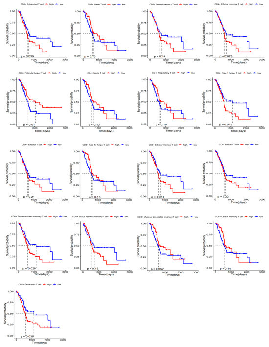 To investigate the relationship between infiltration of different T-cell subtypes and OS of patients with PAAD, we analyzed 182 samples (4 normal + 178 tumors) from TCGA-PAAD data. The GSVA algorithm was utilized to estimate the infiltration levels of various T-cell subsets in PAAD samples. The surv_cutpoint function was employed to determine the optimal cutoff value, thereby categorizing each T-cell subset into high-infiltration and low-infiltration groups (Supplementary Tables S4 and S5). Subsequently, KM survival curves for 17 T-cell subtypes were generated using the OS data from TCGA-PAAD (Figure 5). Among these subtypes, CD8+ TRM, CD8+ TEX, CD4+ TEX, CD4+ type 1 helper T-cell, and CD4+ follicular helper T-cell showed significant prognostic value (p < 0.05).