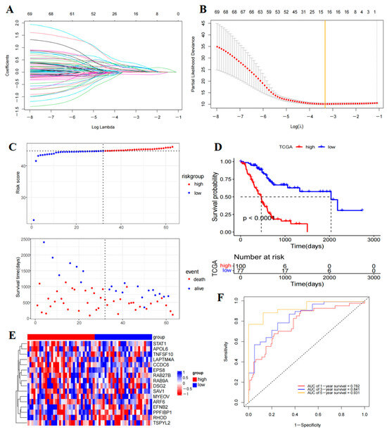 PAAD cohort was used for constructing the T-cell marker gene risk mode. (A,B) LASSO regression was performed to identify 16 DEGs with the most significant prognostic value. (C) Distribution of training cohort risk scores and survival status. (D) Survival analysis KM curves for TCGA PAAD patients based on the risk score in the training cohort. (E) Heatmap displaying the 16 DEGs included in the risk signature. (F) ROC analysis validated the predictive accuracy of the risk signature.