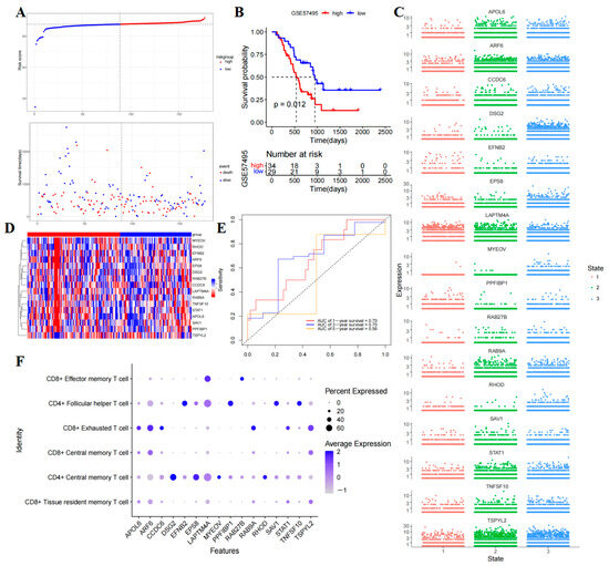 Then, TCGA-PAAD patients were categorized into high- and low-risk groups based on the risk scores (Supplementary Table S8). The KM curve indicated that patients in the high-risk group had significantly lower OS compared to those in the low-risk group (p < 0.0001) (Figure 6D). Additionally, visual representations such as the patient’s risk heatmap, risk score distribution map, and survival status distribution map were generated (Figure 6C–E). Subsequent analysis involved plotting ROC curves for patients, with the AUCs at one, three, and five years being 0.782, 0.841, and 0.931, respectively (Figure 6F). A comprehensive evaluation of the ROC curve demonstrated the superior predictive performance of this prognostic model. Furthermore, external validation using the GSE57495 dataset confirmed that high-risk patients had poorer OS (Figure 7A,B,D) (Supplementary Table S9), with the ROC survival results accurately predicting patient outcomes (AUCs of 0.7, 0.7, and 0.56 for one, three, and five years OS, respectively) (Figure 7E). Subsequently examining the expression of the model genes used for risk score calculation. The dot plot showed changes in the expression of 16 prognostic genes in single-cell data (Figure 7F), while the scatter plot depicted the dynamic expression of these genes across pseudo-time values (Figure 7C).