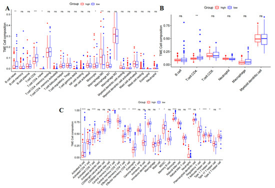 The ESTIMATE R package [56] (https://r-forge.r-project.org/projects/estimate/, accessed on 19 May 2024) was utilized to calculate the sample matrix score, immune score, and tumor purity. Additionally, the immune infiltration and tumor microenvironment (TME) was evaluated using CIBERSORT [57], TIMER [58], and ssGSEA [59] algorithms. The association between risk score and immune checkpoint expression was investigated through the Tumor and Immune System Interaction Database (TISIDB) (http://cis.hku.hk/TISIDB, accessed on 22 May 2024).