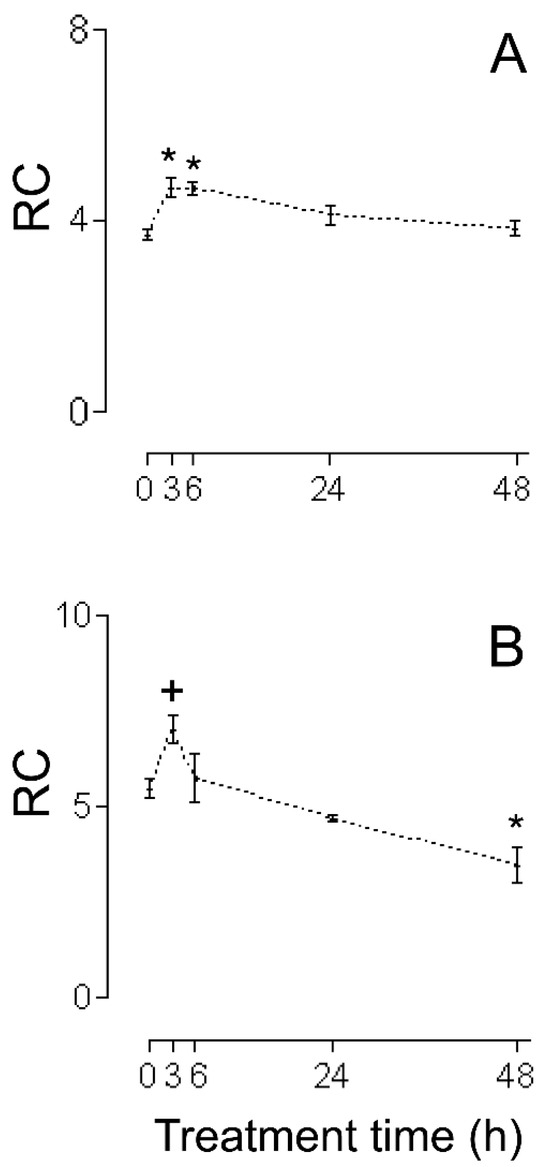 Figure 1. RC (dimensionless) during cellular lesion of myocardium by (−)-isoproterenol. (A) HHs, (B) CHMs. The control group is when the time after (−)-isoproterenol dose is 0 h. All data are averages ±SEM (n = 5 for HHs; for (−)-isoproterenol CHMs: control group n = 6; n = 5 for 3, and 6 h after treatment; n = 4 for 24, and 48 h after treatment). Significant statistical difference from the respective control group: * (p < 0.01) and + (p < 0.05).