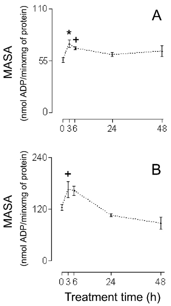 Figure 2. MASA during cellular lesion of myocardium by (−)-isoproterenol. (A) HHs, (B) CHMs. The control group is when the time after. (−)-isoproterenol dose is 0 h. All data are averages ±SEM (n = 5 for HHs; for (−)-isoproterenol CHMs: control group n = 6; n = 5 for 3, and 6 h after treatment; n = 4 for 24, and 48 h after treatment). Significant statistical difference from the respective control group: * (p < 0.01) and + (p < 0.05).