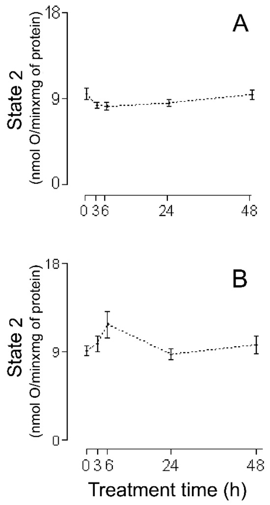 An adequate analysis of the behavior of the mitochondrial respiratory parameters of state 2 and state 3 during a particular animal treatment allows clarifying the mechanism by which mitochondria have improved or worsened their MEFS [23]. In the present investigation using HHs, a slight but not statistically significant decrease (of 12% and 14%, respectively) can be seen (Figure 3A) in homogenate state 2 at 3 h and 6 h after (−)-isoproterenol administration (in these same treatment times, (−)-isoproterenol homogenate state 3 increases slightly but not statistically significantly by 10% and 8%, respectively; see Figure 4A).