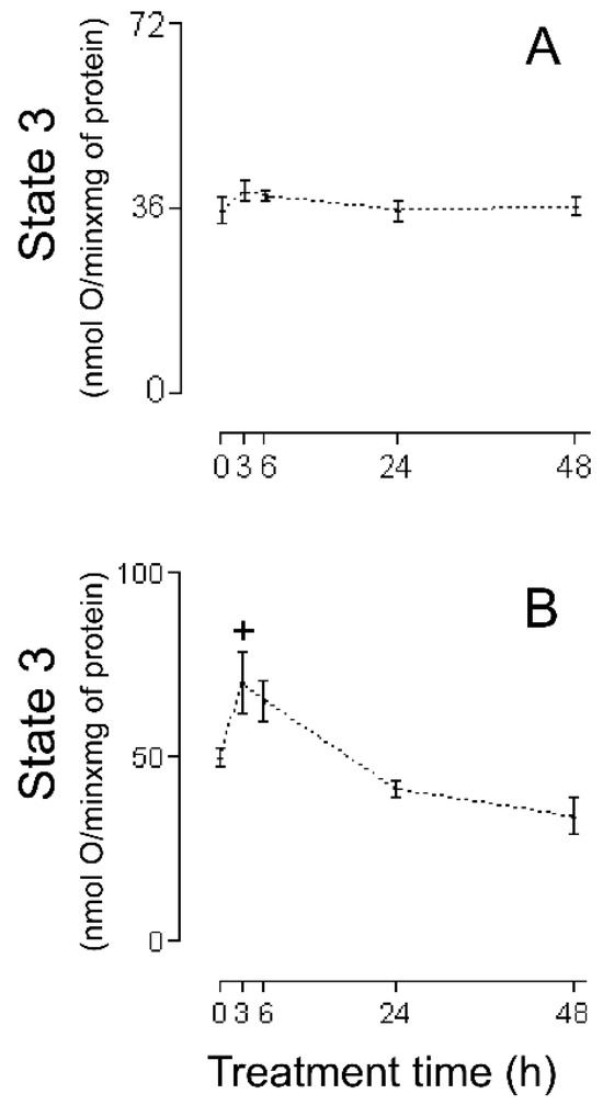 Figure 4. State 3 during cellular lesion of myocardium by (−)-isoproterenol. (A) HHs, (B) CHMs. The control group is when the time after (−)-isoproterenol dose is 0 h. All data are averages ±SEM (n = 5 for HHs; for (−)-isoproterenol CHMs: control group n = 6; n = 5 for 3, and 6 h after treatment; n = 4 for 24, and 48 h after treatment). Significant statistical difference from the respective control group: + (p < 0.05).