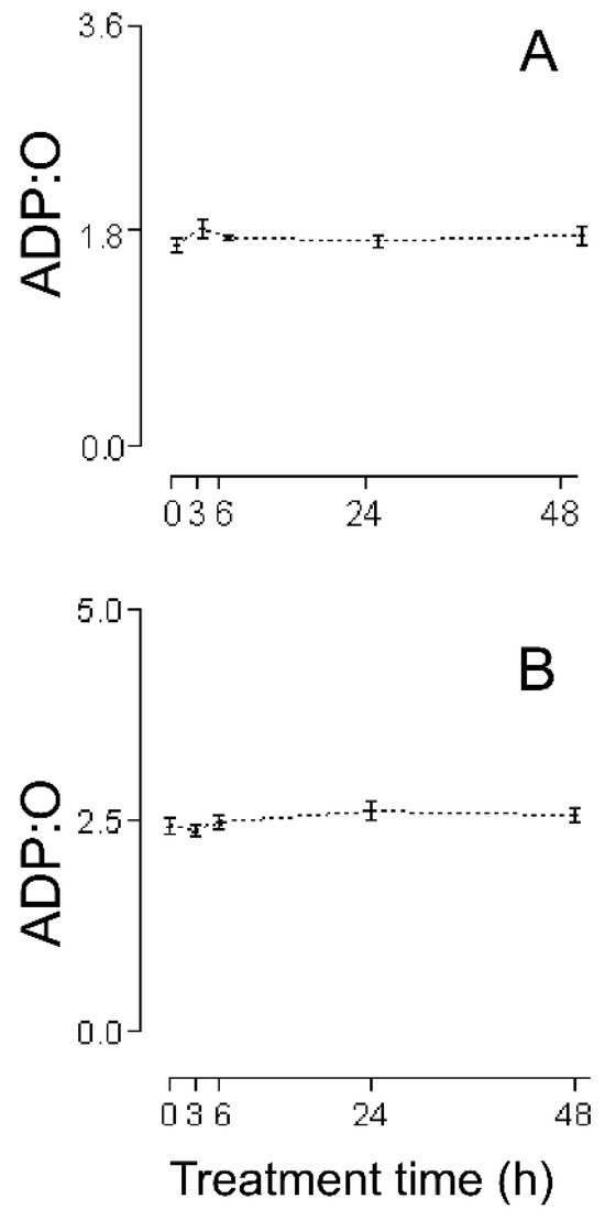 Figure 5. ADP:O (dimensionless) during cellular lesion of myocardium by (−)-isoproterenol. (A) HHs, (B) CHMs. The control group is when the time after (−)-isoproterenol dose is 0 h. All data are averages ±SEM (n = 5 for HHs; for (−)-isoproterenol CHMs: control group n = 6; n = 5 for 3, and 6 h after treatment; n = 4 for 24, and 48 h after treatment).