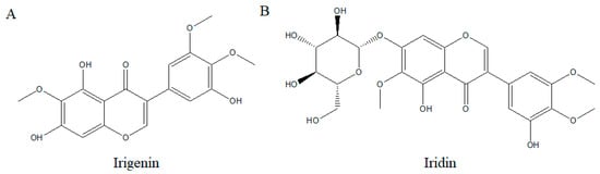 - Hu, T.; Ge, X.; Wang, J.; Zhang, N.; Diao, X.; Hu, L.; Wang, X. Metabolite identification of iridin in rats by using UHPLC-MS/MS and pharmacokinetic study of its metabolite irigenin. J. Chromatogr. B 2021, 1181, 122914. [Google Scholar] [CrossRef]