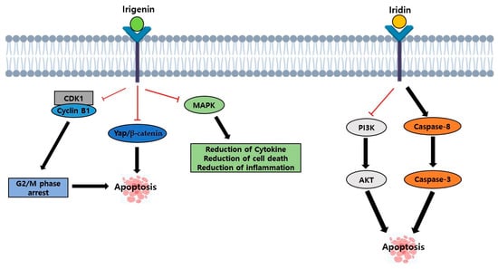 - Zhan, Y.; Kong, S.; Fan, L.; Jiang, J. Irigenin exhibits anticancer activity against human colon cancer cells via autophagy, inhibition of cell migration and invasion, and targeting of ERK/MAPK signal pathway. Trop. J. Pharm. Res. 2021, 20, 1357–1363. [Google Scholar] [CrossRef]