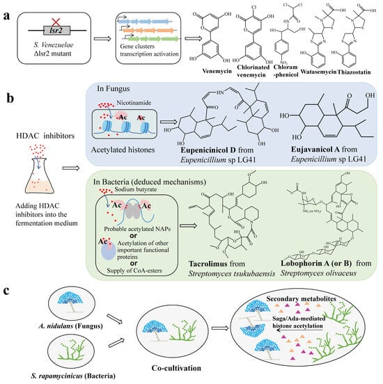 - Nützmann, H.W.; Reyes-Dominguez, Y.; Scherlach, K.; Schroeckh, V.; Horn, F.; Gacek, A.; Schümann, J.; Hertweck, C.; Strauss, J.; Brakhage, A.A. Bacteria-induced natural product formation in the fungus Aspergillus nidulans requires Saga/Ada-mediated histone acetylation. Proc. Natl. Acad. Sci. USA 2011, 108, 14282–14287. [Google Scholar] [CrossRef]