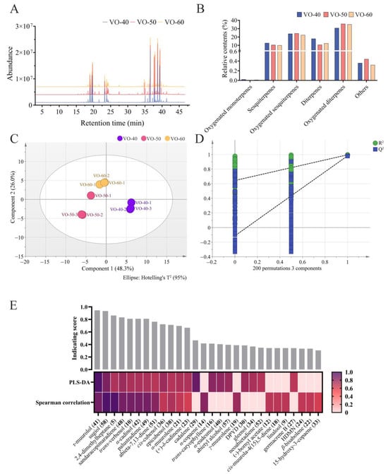 Chemical composition of VOs in C. japonica solid wood boards with different tree ages. (A) Total ions chromatograms of VO-40, 50, and 60. (B) Relative contents of each category of VOs. (C) PLS-DA score plot with the model parameter values of R2X (cum) = 0.825, R2Y (cum) = 0.994, Q2 (cum) = 0.927. (D) Permutation test plot with 200 iterations with intercepts of R2 = 0.644, Q2 = −0.113. (E) Heatmap of 28 potential differential VOCs selected by PLS-DA and Spearman’s correlation analysis, displaying VIP value and coefficient normalized by a min–max scaler. The histogram above the heatmap shows the indication scores of each VOC, calculated as the average of normalized VIP value and coefficient. Abbreviation: DPYD, (1R,4R,5R,6R,7S,10R)-4,10-di-methyl-7-propan-2-yltricyclo[4.4.0.01,5]decan-4-ol; HDMN, 1,2,3,4,4a,7-hexahydro-1,6-di-methyl-4-(1-methylethyl)-naphthalene.