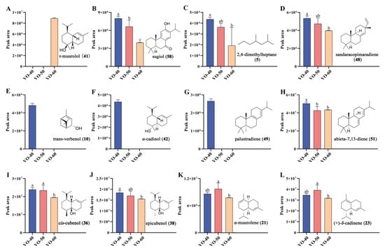 Peak area changes and chemical structures of 12 differential VOCs between VO-40, 50, and 60 in C. japonica solid wood boards. (A) τ-Muurolol. (B) Sugiol. (C) 2,4-Dimethylheptane. (D) Sandaracopimaradiene. (E) Trans-verbenol. (F) α-Cadinol. (G) Palustradiene. (H) Abieta-7,13-diene. (I) Cis-cubenol, (J) Epicubenol. (K) α-Muurolene. (L) (+)-δ-Cadinene. Different letters indicate significant differences at the 0.05 level.