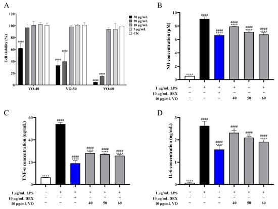 To determine the anti-inflammatory activity of VOs, RAW264.7 cells (1 × 105 cells/mL) were seeded in 96-well plates and cultured for 24 h. Then, they were subcultured into four groups: control group: without any treatment, LPS group: treated with 1 μg/mL LPS, experiment group: treated with 10 μg/mL VOs (VO-40, 50, and 60) and 1 μg/mL LPS, positive control group: treated with 10 μg/mL dexamethasone (DEX) and 1 μg/mL LPS. After treatment for 24 h, the concentrations of NO, TNF-α, and IL-6 in culture supernatants were measured. The NO concentrations in the cell culture supernatants were determined by the Griess reagent kit (Beyotime Institute of Biotechnology, Haimen, China). The liquid supernatant (50 μL) was added to 100 μL Griess reagent, and then measured at 450 nm using a micro-plate reader (Spectramax 190, Molecular Devices, Sunnyvale, CA, USA). The TNF-α and IL-6 levels in cell culture supernatants were measured using enzyme-linked immunosorbent assay (ELISA) kits (ABclonal, Wuhan, China), according to the manufacturer’s instructions.