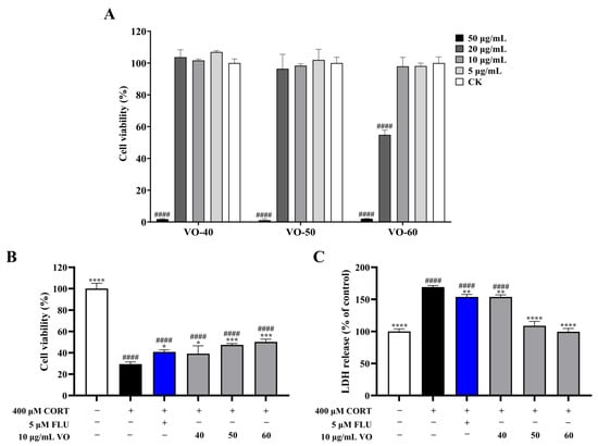 To determine the potential neuroprotective activity of VOs, PC12 cells were seeded in 96-well plates and cultured for 24 h. Then, the cells were divided into the control group, CORT group, experiment group, and positive control group. The cells in the experiment and positive control groups were added to 400 μM CORT for 24 h, and then treated with 10 μg/mL VOs (VO-40, 50, and 60) or 5 μg/mL fluoxetine (FLU) for 24 h. The cells in the CORT group were first treated with 400 μM CORT for 24 h, and then replaced with an equal amount of the serum-free RPMI 1640 medium. The cells in control group did not undergo any treatment. After treatment for 48 h, the cell viability of all groups was measured using CCK-8 assay. And an LDH measurement of supernatant was performed using LDH cytotoxicity assay kit protocol (Elabscience, Wuhan, China), according to the manufacturer’s instructions.