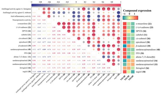 Pearson’s correlation analysis was carried out to investigate the potential relationship between the compounds with relative content > 1% of VOs with their antifungal, anti-inflammatory, and potential neuroprotective activities (Figure 5). The VOs showed good antifungal activity against A. fumigatu and G. trabeum, and the correlation analysis was used to identify the potential active compounds. The antifungal activity of VOs against A. fumigatus showed a significantly positive correlation with β-eudesmol (39), sandaracopimarinal (54), and sandaracopimarinol (55) (p < 0.0001), and a strong correlation with ferruginol (56) (p < 0.01). The antifungal activity of VOs against G. trabeum was positively correlated with 54, 55, and 39 (p > 0.05), but their correlation coefficients were low. This suggests that the primary influence is from synergistic effects of multiple compounds, rather than a single main compounds. Furthermore, the anti-inflammatory and potential neuroprotective activities of VOs were also positively correlated with 54, 55, 39, and 56, especially with significant correlations between the anti-inflammatory activity and 54 (p < 0.05), and significant correlations between the potential neuroprotective effect and 54, 55, and 39 (p < 0.01).