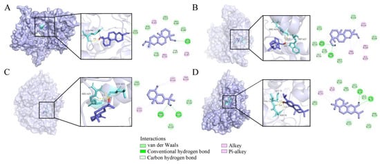 Four compounds docked with chitin synthase. (A) Sandaracopimarinol. (B) Sandaracopimarinol. (C) β-Eudesmol. (D) Ferruginol. From left to right, overall 3D, partial SD, and 2D images in order. Light purple, acro-molecules; purple, active compounds; aquamarine, amino acid residues around the binding bag; yellow dashed lines, hydrogen bonds in 3D image.