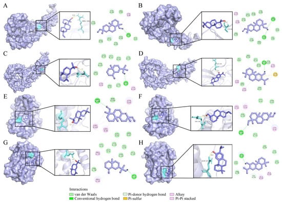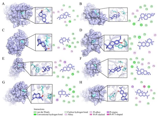 Four compounds docked with TNF-α and IL-6. (A) Sandaracopimarinol with TNF-α. (B) Sandaracopimarinol with TNF-α. (C) β-Eudesmol with TNF-α. (D) Ferruginol with TNF-α. (E) Sandaracopimarinol with IL-6. (F) Sandaracopimarinol with IL-6. (G) β-Eudesmol with IL-6. (H) Ferruginol with IL-6. From left to right, overall 3D, partial 3D, and 2D images in order. Light purple, acro-molecules; purple, active compounds; aquamarine, amino acid residues around the binding bag; yellow dashed lines, hydrogen bonds in 3D image.