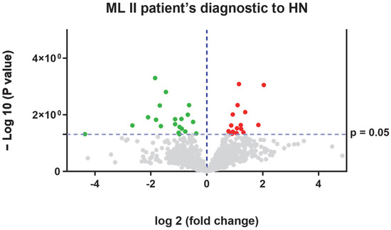 Volcano plot obtained from SWATH-MS quantitative proteomics analysis. The red dots represent proteins upregulated in ML II patients at diagnosis vs. neonatal healthy samples and green dots represent proteins upregulated in neonatal healthy vs. ML II patients.