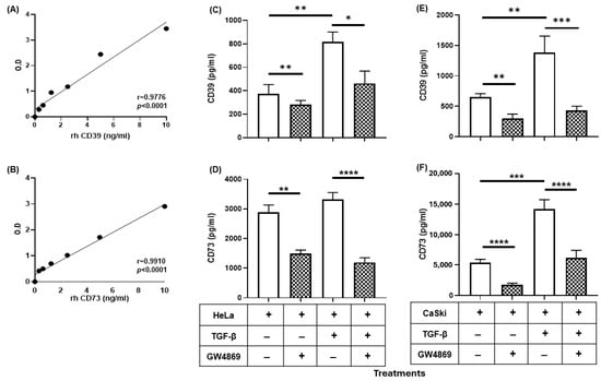 CD39 and CD73 levels in CC cell supernatants. HeLa and CaSki cells (1 × 106) were cultured for 72 h in the presence or absence of 20 ng/mL TGF-β and in the presence or absence of 20 µM GW4869, an inhibitor of exosome formation and release. The concentrations of CD39 and CD73 in the supernatants of HeLa and CaSki cells were evaluated via ELISA using standard curves generated with different known concentrations (0–10 ng/mL) of rh-CD39 (A) and rh-CD73 (B). The concentrations of CD39 and CD73 in the supernatants of HeLa (C,D) and CaSki (E,F) cells were determined by interpolating the unknown values from the standard curves. The statistical significance was calculated using the one-way ANOVA followed by Sidak’s post hoc test for multiple comparisons. Representative data from three independent experiments ± SEM are shown. * p < 0.05; ** p < 0.01; *** p < 0.001; **** p < 0.0001.
