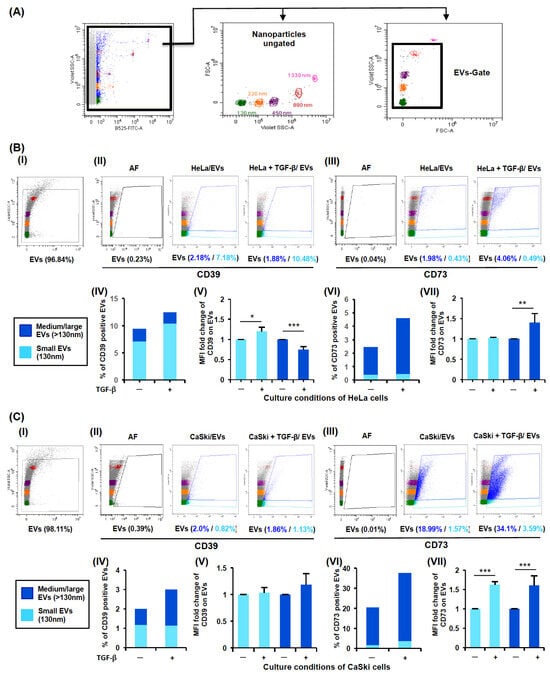 To evaluate the effect of TGF-β on the expression of CD39 and CD73 in EVs, the mean fluorescence intensity (MFI) of the small and medium-large HeLa/EVs or CaSki/EVs positive for CD39 or CD73 was normalized to 1. We observed that small HeLa + TGF-β/EVs (Figure 3B(V)), medium-large HeLa + TGF-β/EVs (Figure 3B(VII)), and small and medium-large CaSki + TGF-β/EVs (Figure 3C(VII)) presented significantly increased expression of CD39 or CD73, with MFI values of 1.20 ± 0.1 and 1.4 ± 0.221 and of 1.62 ± 0.08 and 1.6 ± 0.25, respectively. These results indicate that TGF-β increases the release of EVs enriched with CD39 and CD73 from CC cells.