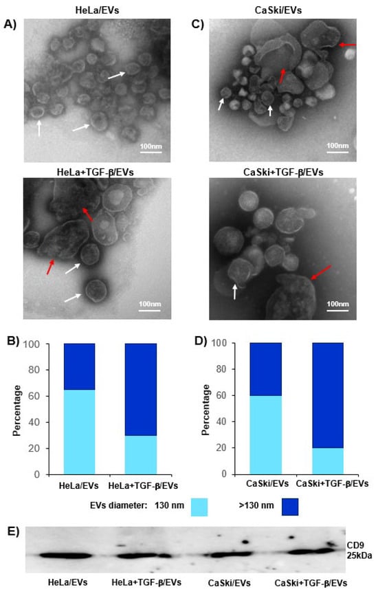 Characteristics of EVs released by CC cells cultured in the absence or presence of TGF-β. HeLa or CaSki cells (1 × 107 of each) were cultured for 72 h in the presence or absence of 20 ng/mL rh-TGF-β. The EVs obtained from the supernatants of CC cells cultured in the absence (HeLa/EVs or CaSki-EVs) or presence of rh-TGF-β (HeLa + TGF-β/EVs or CaSki + TGF-β/EVs) were analyzed via transmission electron microscopy (A,C) and flow cytometry using fluorescent nanospheres of different sizes, as described in the Materials and Methods (B,D). The percentages of EVs with diameters < 130 nm (white arrows) and between 130 and 880 nm (red arrows) are also shown (B,D). The expression of CD9 in each of the EVs was determined by Western blotting, using twenty micrograms of total protein (based on the albumin type curve) (E).