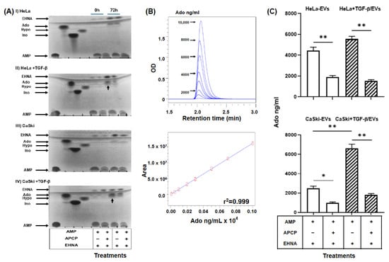 Adenosine is produced by EVs secreted by CC cells. EVs (50 μg) obtained from the supernatants of CC cells cultured in the absence (HeLa/EVs or CaSki-EVs) or presence (HeLa + TGF-β/EVs or CaSki + TGF-β/EVs) of 20 ng/mL rh-TGF-β were incubated for 72 h in the presence of 2.5 mM AMP, in the presence or absence of 2.5 mM APCP (an inhibitor of the enzymatic activity of CD73), or in the presence of 1 mM EHNA (an inhibitor of the enzymatic activity of adenosine deaminase). (A) The hydrolysis products were visualized via TLC. The increased capacity of HeLa + TGF-β/EVs or CaSki + TGF-β/EVs to hydrolyze AMP is indicated by arrows. (B) The amount of adenosine (Ado) produced by EVs was evaluated via UPLC using a typical Ado standard curve. (C) The concentrations of Ado generated by the EVs ± SEM are shown. The statistical significance was calculated using the one-way ANOVA followed by Sidak’s post hoc test for multiple comparisons. * p < 0.05; ** p < 0.01. Representative data from three independent experiments are shown. AMP, adenosine monophosphate; APCP, adenosine 5′-(α,β-methylene) diphosphate; EHNA, (+) erythro-9-(2-hydroxy-3-nonyl) adenine; Hypo, hypoxanthine; Ino, inosine.