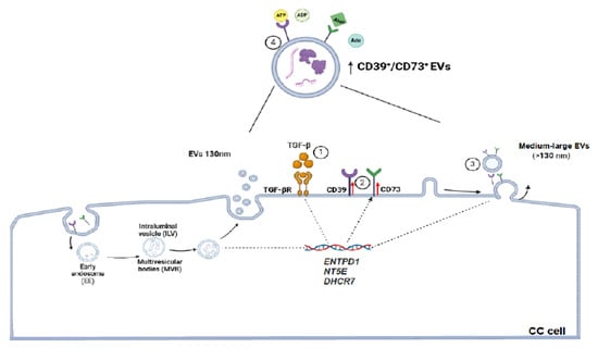 This study provides evidence, for the first time, that TGF-β induces an increase in the expression of CD39 and CD73 in CC cells and promotes the secretion of medium-large EVs enriched with these ectonucleotidases with a high capacity to generate Ado. These results suggest that TGF-β, a factor highly expressed in the CC TME, may favor neoplastic progression by increasing adenosinergic activity mediated by tumor cells and the secretion of active CD39- and CD73-enriched EVs. Consequently, the inhibition of CD39+ CD73+ EVs could be a strategy for the treatment of CC.