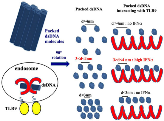 CXCL4 organizes dsDNA into immunogenic liquid–crystalline complexes suitable for TLR9-mediated IFN-α production. Inter-DNA spacing close to the steric size of TLR9 (d = 3–4 nm) allows the optimal binding of columnar DNA lattices to TLR9-clustered arrays. CXCL4 organizes DNA into liquid–crystalline columnar lattices at an inter-DNA spacing compatible with TLR9 amplification. DNA fragmentation increases the total number of discrete DNA fragments for the same mass of DNA, with optimal close packing of DNA ligands [38].
