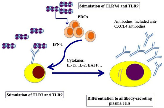 Model for B-cell activation via CXCL4–DNA/RNA complexes. After stimulation through TLR7/8/9 by CXCL4–DNA/RNA complexes, pDCs become activated and start to produce IFN-I, which, together with BAFF, IL-15, IL-2, help plasma cell differentiation (pDCs can also produce BAFF, [58], whereas IL-15 and IL-2 can be produced by T cells but also by stroll cells, monocytes, etc. [59]). Afterward, B-cell transition and differentiation in antibody-secreting plasma cells occurs. In SSc, activated B cells start to produce antibodies, among which there could be anti-CXCL4 antibodies.