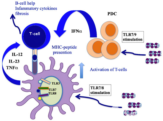 - Ah Kioon, M.D.; Tripodo, C.; Fernandez, D.; Kirou, K.A.; Spiera, R.F.; Crow, M.K.; Gordon, J.K.; Barrat, F.J. Plasmacytoid Dendritic Cells Promote Systemic Sclerosis with a Key Role for TLR8. Sci. Transl. Med. 2018, 10, eaam8458. [Google Scholar] [CrossRef] [PubMed]