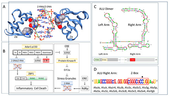 ADAR1 (adenosine deaminase RNA specific) is an enzyme that can edit double-stranded RNA (dsRNA) by deaminating adenosine to form inosine. Its actions prevent the induction of interferon responses (Figure 1), and generate nonsynonymous codon edits in some 2261 human genes [1]. ADAR1 has multiple domains, three of which enable the recognition of dsRNA [2]; another, called Zα, that binds to left-handed Z-DNA and Z-RNA (collectively called ZNA) [3] (Figure 1A); a less well characterized Zβ domain that does not bind Z-DNA; and a C-terminal deaminase domain that catalyzes the replacement of the adenosine N6 amino group with a keto group, yielding inosine (A-to-I edit) in double-stranded (dsRNA) editing substrates. Most edits in human cells are to dsRNA substrates formed by ALU inverted repeats (AIR) [4,5,6,7,8,9]. ALUs are a form of SINE (Short Interspersed Nuclear Elements), with over one million copies in the human genome with the highest density in the GC-rich isochores [10]. Other endogenous repeat elements (EREs), such as LINES (Long Interspersed Nuclear Elements) and LTRs (long terminal repeats), also undergo editing. The binding of ADAR1 to the Z-RNA formed by these transcripts terminates the interferon response against host-encoded RNAs [11,12,13,14,15,16,17].