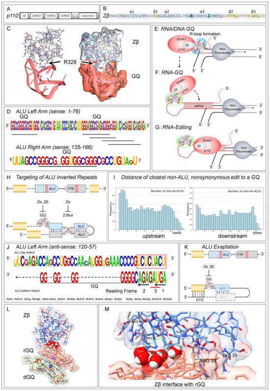 The ALUs targeted by p110 and p150 editing have the potential to form GQs [85], with the sequences underscored in Figure 2D [4,5,7,131]. They are more likely to form rGQ than dGQ, as the 2′-OH renders a GQ formed from a stack of two RNA tetrads much more stable than one made from two DNA tetrads [90,91]. The different nuclear and cytoplasmic roles of Zα and Zβ domains possibly underlie the evolution of different ALU families. One set of ALUs contains a perfect ZNA-forming alternating cytosine and guanosine motif (Figure 1D), while other families have a GQ motif at this location (Figure 2D,K).
