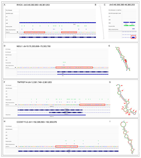 In some cases, the transcripts that form GQ will also form dsRNA editing substrates. We present several examples that exemplify several different scenarios (Figure 3). An AIR can produce long dsRNA with multiple edits and GQ motifs (Figure 3A–C). The intriguing possibility exists that the initial editing of these elements fosters the formation of additional GQs that are stabilized by the substitution of inosine for adenosine. The de novo GQs then promote the docking of multiple ADAR1 enzymes to the substrate leading to the hyper-editing of the transcript [95,96,137] that disrupts any splice sites in the region [138]. Figure 3D,E show that the well-known K242R edit of NEIL1 (endonuclease VIII-like DNA glycosylase) is associated with a GQ motif ([139,140,141,142]. With the TNFRSF14 transcript, A-to-I edits are associated with a GQ motif and alternative splicing events (Figure 3E,F) [1,32,33,34,143]. The edited FLG (filaggrin) RNA is also associated with both a GQ and an antisense CCDST (cervical cancer associated DHX9 suppressive transcript) RNA (Figure 3H,I). The sense, anti-sense pairing could potentially form a dsRNA editing substrate, but edits are only found on the sense strand, suggesting that folding of the FLG RNA on itself is sufficient to induce A-to-I substitutions (Figure 3I).