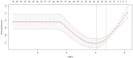 Before applying the feature selection methods of 146 plasma proteomic biomarkers, the protein levels were transformed to the Z score, as distributions of protein levels may be skewed. The Z-score was computed for each protein using the mean and standard deviation (SD). The Least Absolute Shrinkage and Selection Operator (LASSO) in the R package “glmnet” version 4.1-8 was used to perform feature selection using logistic regression []. LASSO is an embedded feature selection method used for ML and regression analysis. The LASSO method regularizes model parameter λ by shrinking the regression coefficients, reducing some of them to zero. Therefore, LASSO effectively performs feature selection, identifying and retaining only the most relevant features []. This makes LASSO useful for simplifying models, improving interpretability, and potentially preventing overfitting.