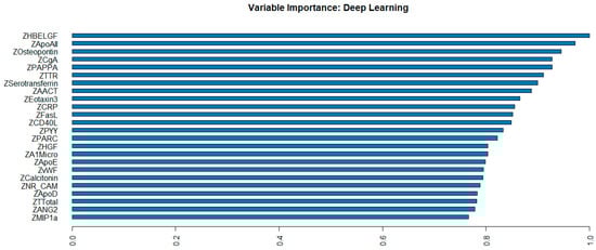 Variable importance of deep learning model with “Rectifier With Dropout” using 2 hidden layers of 32 proteomic biomarkers.