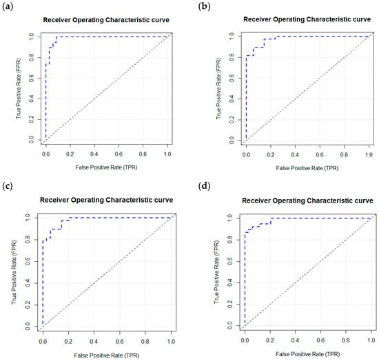 AUC curves in the validation data using a deep learning model with an H2O package. H2O. (a) Deep learning model using a Rectifier Activation Function with Dropout, 2 layers, and 32 inputs. (b) Deep learning model using a Tanh Activation Function with Dropout, 3 layers, and 32 inputs. (c) Deep learning model using a Tanh Activation Function with Dropout, 3 layers, and 33 inputs. (d) Deep learning model using a Tanh Activation Function with 2 layers and 32 inputs.