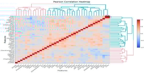 Pearson correlation heatmap for 39 variables based on Z-scores.